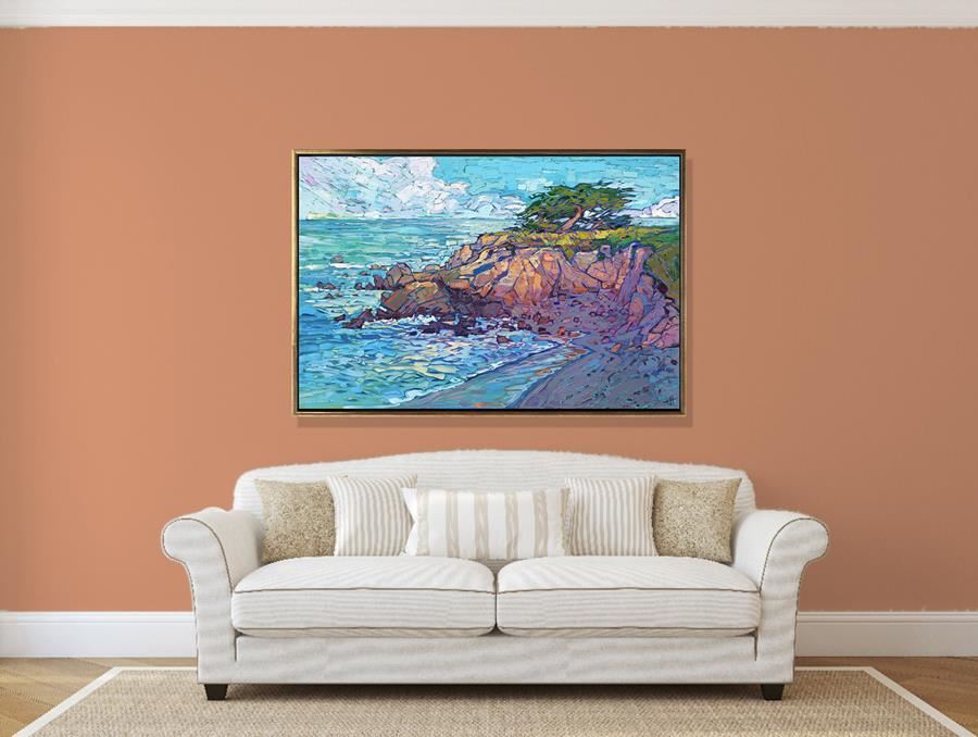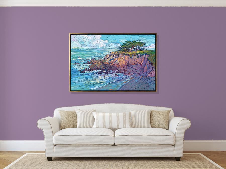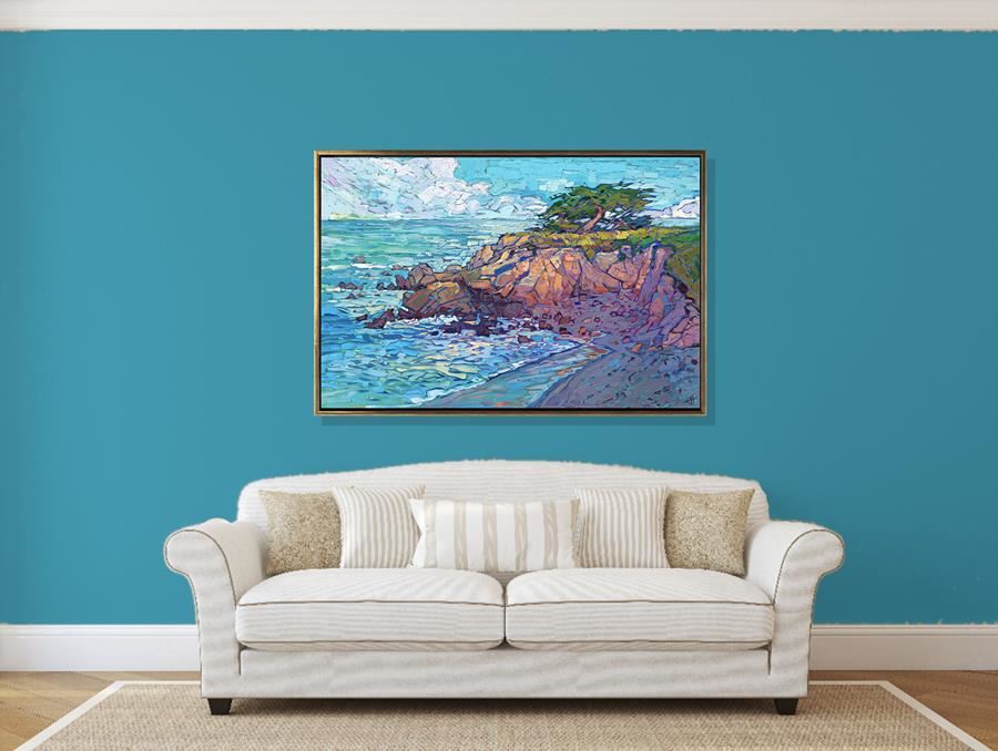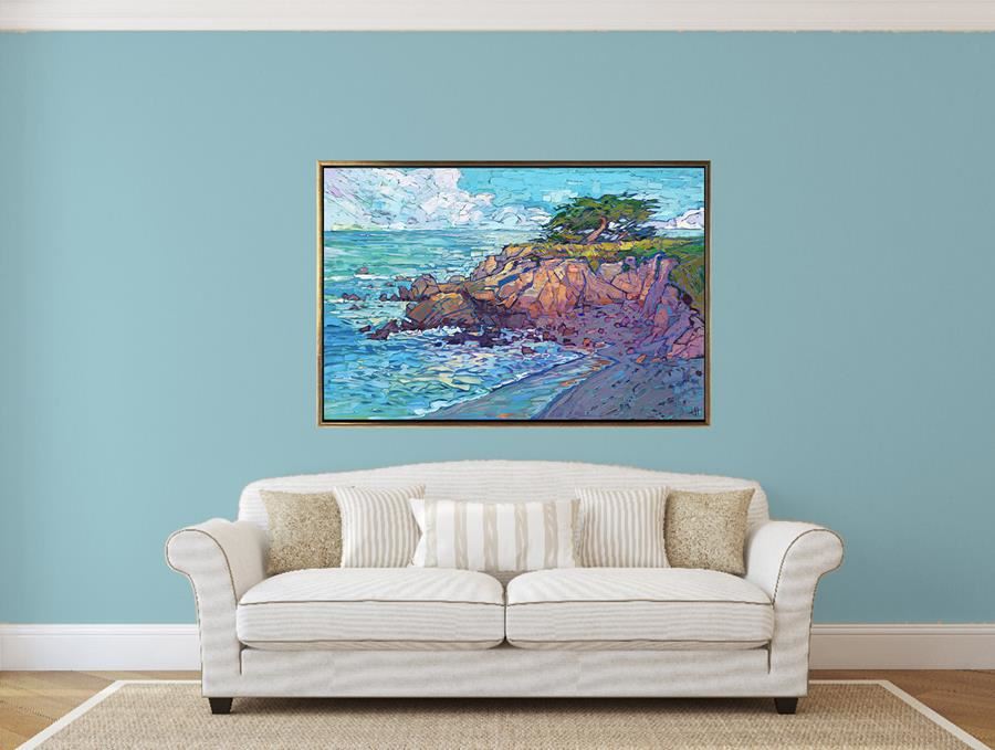First, let's determine which color is the predominant color in the painting, especially around the edges. In this painting Cypress Coast, the predominant color is aquamarine.