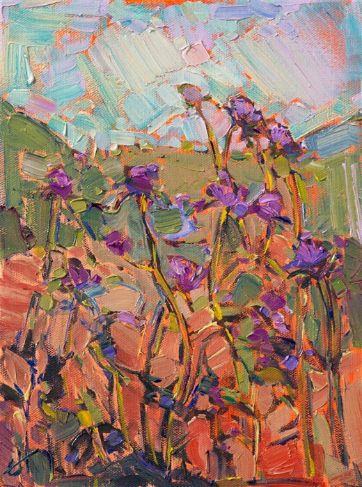 "Our group is huddled together, about twenty-five of us, as Erin shares her now 10-years of painting tips. Her work recalls post-impressionist colorists like Van Gogh and Sandzen — electric color that pulls the eye into the canvas to explore her cobalt blue shadows and bold stroke work. As we watch her complete her color mixing the canvas awaits on the easel. She has a thin wash of magenta, Alizarin red and a bit of Cadmium yellow light as her under-painting. This color will come through in places and serve as a network of lines that reveal what Erin calls a 'mosaic approach,' to paint the details and negative spaces that form the shape of her subject, define the linear planes, and bring cohesiveness to the composition. In hand she has two photos for her inspiration: a horizontal bank of distant mountains with rolling hills and scattered green copses and a singular eucalyptus that will serve as her main character. She quickly divides her canvas into thirds, vertically and then horizontally. This creates a loose grid to organize her composition. Briskly, with a brush dabbed with a bit of Ultramarine, she sketches out her idea, developing balance and movement all the while thinking about how the colors she just mixed will work in her composition. Then the painting begins, we watch her ideas materialize — the artist in action, coaxing the color, creating a path for the eye to travel, her mind’s eye transposed to the canvas. It’s a wonder to behold.