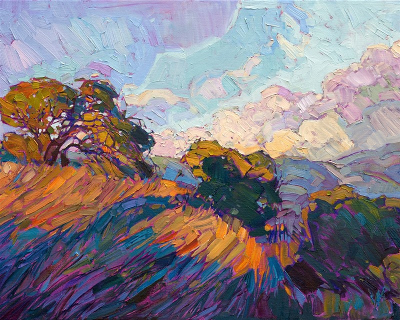 Style: "Open Impressionism" is a new style of painting developed by American artist Erin Hanson. The style is characterized by short, impasto brush strokes that are applied without layering, creating a mosaic or stained-glass appearance to the paintings. The paintings are created with a limited palette of colors, applied without blending or mixing upon the canvas, which adds a dimension of texture to each brush stroke. Inspired by classic impressionism, pointillism, and post-impressionism, Erin Hanson continues the tradition of impressionism into the modern day with her colorful and vivacious landscape paintings.