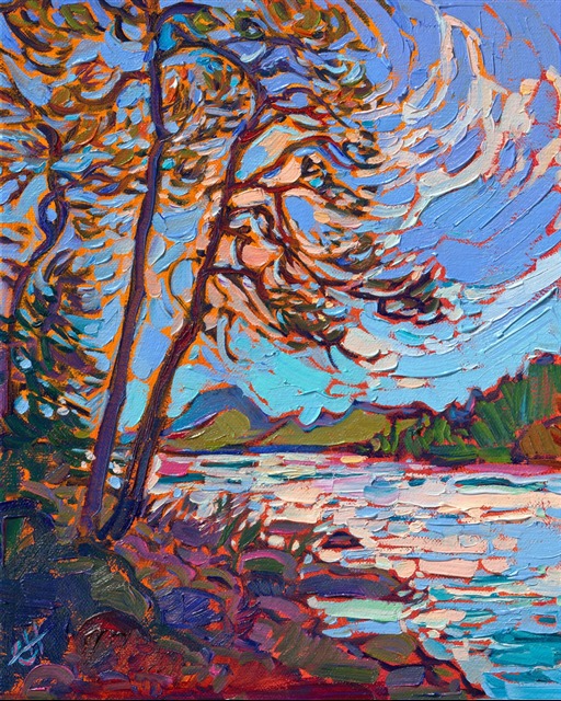 Acadia National Park is captured in vivid colors that spark the imagination. Thick brush strokes of oil paint placed side by side without layers is a hallmark of Erin's Open Impressionism painting style.