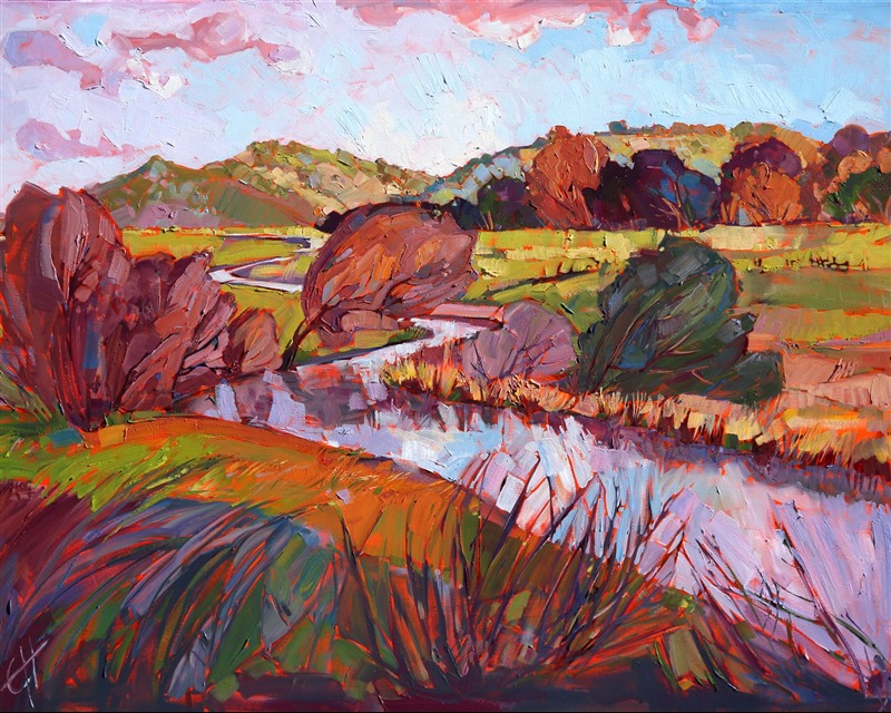 Style: "Open Impressionism" is a new style of painting developed by American artist Erin Hanson. The style is characterized by short, impasto brush strokes that are applied without layering, creating a mosaic or stained-glass appearance to the paintings. The paintings are created with a limited palette of colors, applied without blending or mixing upon the canvas, which adds a dimension of texture to each brush stroke. Inspired by classic impressionism, pointillism, and post-impressionism, Erin Hanson continues the tradition of impressionism into the modern day with her colorful and vivacious landscape paintings.