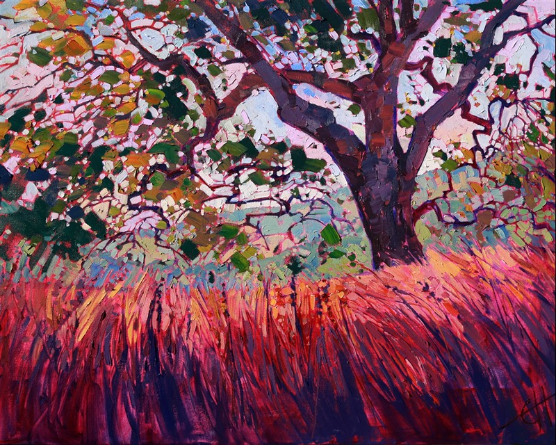 Style: "Open Impressionism" is a new style of painting developed by American artist Erin Hanson. The style is characterized by short, impasto brush strokes that are applied without layering, creating a mosaic or stained-glass appearance to the paintings. The paintings are created with a limited palette of colors, applied without blending or mixing upon the canvas, which adds a dimension of texture to each brush stroke. Inspired by classic impressionism, pointillism, and post-impressionism, Erin Hanson continues the tradition of impressionism into the modern day with her colorful and vivacious landscape paintings.