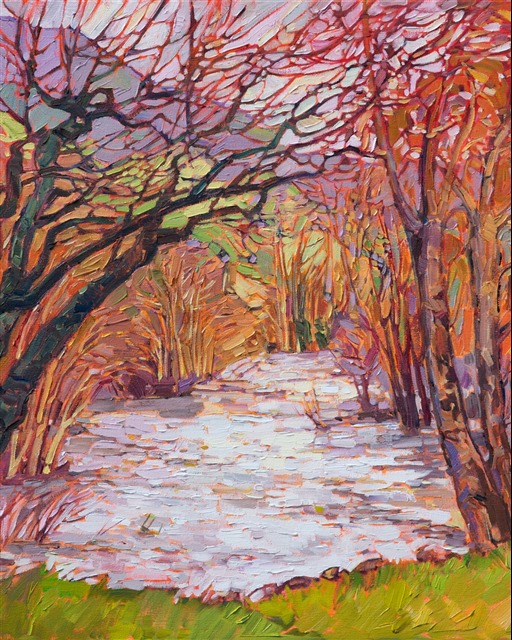 Style: "Open Impressionism" is a new style of painting developed by American artist Erin Hanson. The style is characterized by short, impasto brush strokes that are applied without layering, creating a mosaic or stained-glass appearance to the paintings. The paintings are created with a limited palette of colors, applied without blending or mixing upon the canvas, which adds a dimension of texture to each brush stroke. Inspired by classic impressionism, pointillism, and post-impressionism, Erin Hanson continues the tradition of impressionism into the modern day with her colorful and vivacious landscape paintings.