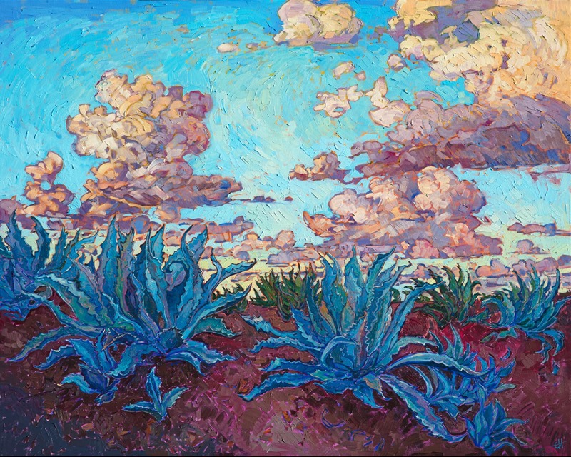 Dramatic clouds move over the agave-planted earth, glowing with color in the fading light of day. The thick, impasto brush strokes are loose and impressionistic, capturing the movement of the scene.