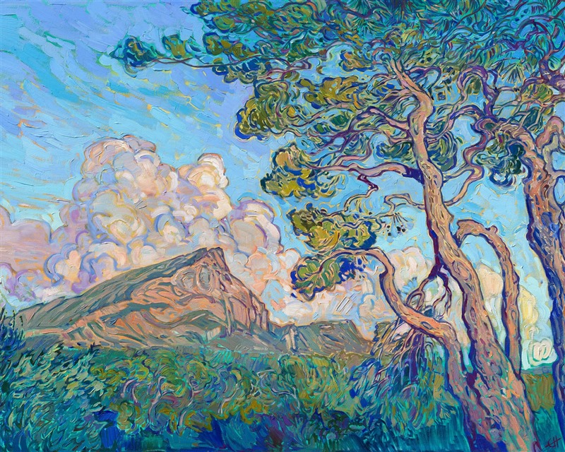Aix-en-Provence is a beautiful town in the south of France, where you can see the mountain made famous by post-impressionist Cezanne. Erin Hanson puts her modern abstract/expressionist take on impressionism (in her signature style known as Open Impressionism) and paints Cezanne's mountain in wide, lush brushstrokes of oil laid side by side without blending on the canvas.