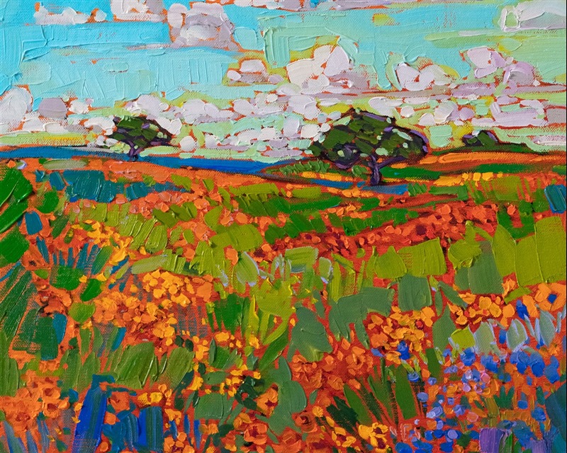 Erin devoted three years to perfecting the technology of 3D art printing in a quest to create a fine art print that captured her vibrant colors and reproduced the texture crucial to her artistic vision. The rhythms of texture in her luscious, impasto oil paintings communicate the movement and joy she finds in nature.