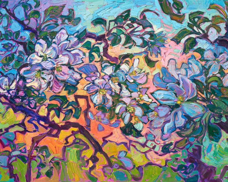Note on varnishing: Erin’s paintings take six to eight weeks to dry, at which time we apply a retouching varnish, which allows the painting to complete the curing process while having a layer of protection against dirt and scuffs. The full curing process for an impasto oil painting takes at least two years. We are happy to assist in applying a final finishing varnish to your Erin Hanson oil painting once it has been dry for at least two years. Here is more information on how to care for your original oil painting.