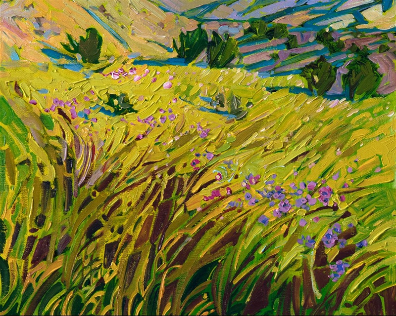 Style: "Open Impressionism" is a new style of painting developed by American artist Erin Hanson. The style is characterized by short, impasto brush strokes that are applied without layering, creating a mosaic or stained-glass appearance to the paintings. The paintings are created with a limited palette of colors, applied without blending or mixing upon the canvas, which adds a dimension of texture to each brush stroke. Inspired by classic impressionism, pointillism, and post-impressionism, Erin Hanson continues the tradition of impressionism into the modern day with her colorful and vivacious landscape paintings.