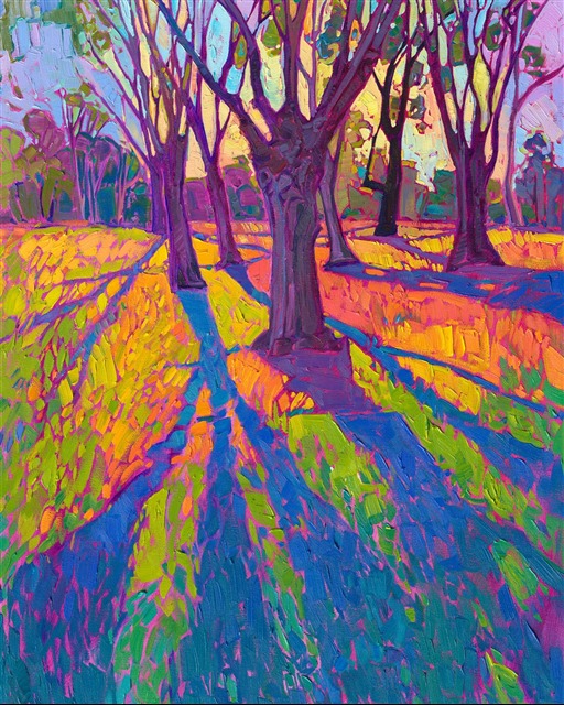 Erin Hanson's canvas prints have the illusion of texture, and they accurately reproduce the brilliant colors of Erin's originals. Canvas prints are printed directly onto canvas rolls using our state-of-the-art Epsom printer. These prints do not have texture applied -- they are flat prints, but they accurately capture the illusion of texture because of the shadows cast by the paint ridges during photography. The canvas prints come rolled, stretched, or framed and ready to hang.