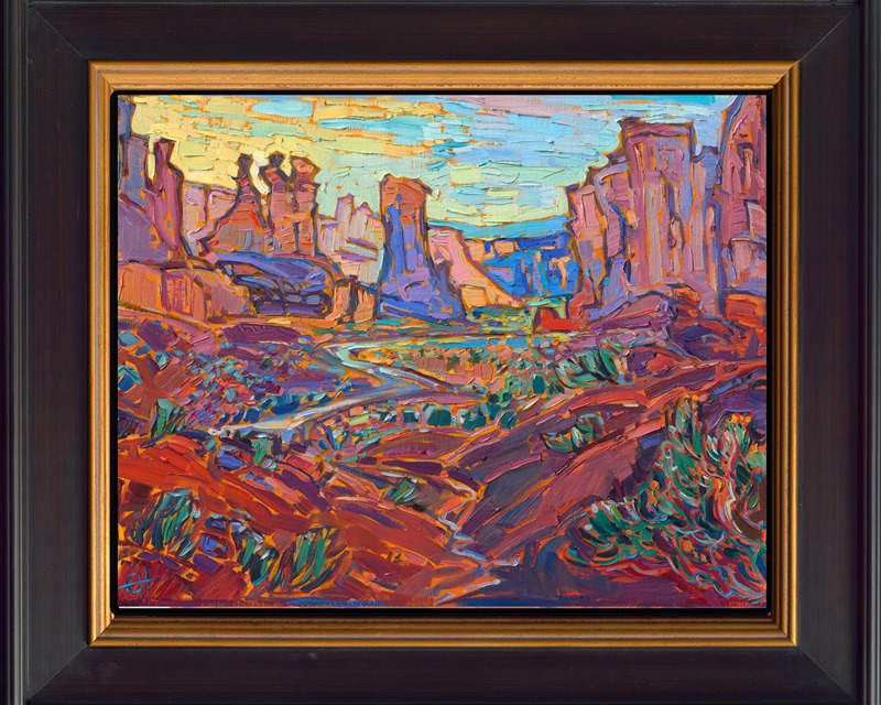 Framing: "Arches Summer" is an original oil painting created in Erin Hanson's impasto style of Open Impressionism. The piece arrives framed in a "mock floater" black and gold plein air frame.