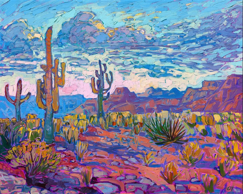 Note on varnishing: Erin’s paintings take six to eight weeks to dry, at which time we apply a retouching varnish, which allows the painting to complete the curing process while having a layer of protection against dirt and scuffs. The full curing process for an impasto oil painting takes at least two years. We are happy to assist in applying a final finishing varnish to your Erin Hanson oil painting once it has been dry for at least two years. Here is more information on how to care for your original oil painting.
