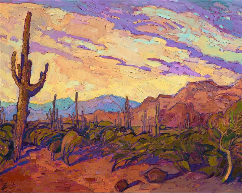 Note on varnishing: Erin’s paintings take six to eight weeks to dry, at which time we apply a retouching varnish, which allows the painting to complete the curing process while having a layer of protection against dirt and scuffs. The full curing process for an impasto oil painting takes at least two years. We are happy to assist in applying a final finishing varnish to your Erin Hanson oil painting once it has been dry for at least two years. Here is more information on how to care for your original oil painting.