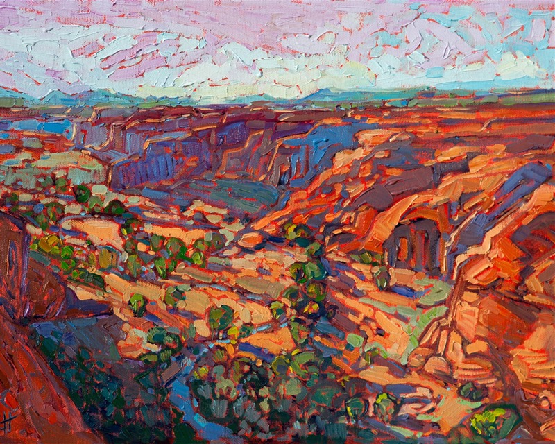 Canyon de Chelly has drawn be back to paint its ever-changing colors and shadows, year after year. This painting shows the delicate early spring colors as canyon floor becomes sprinkled with tender green shoots.