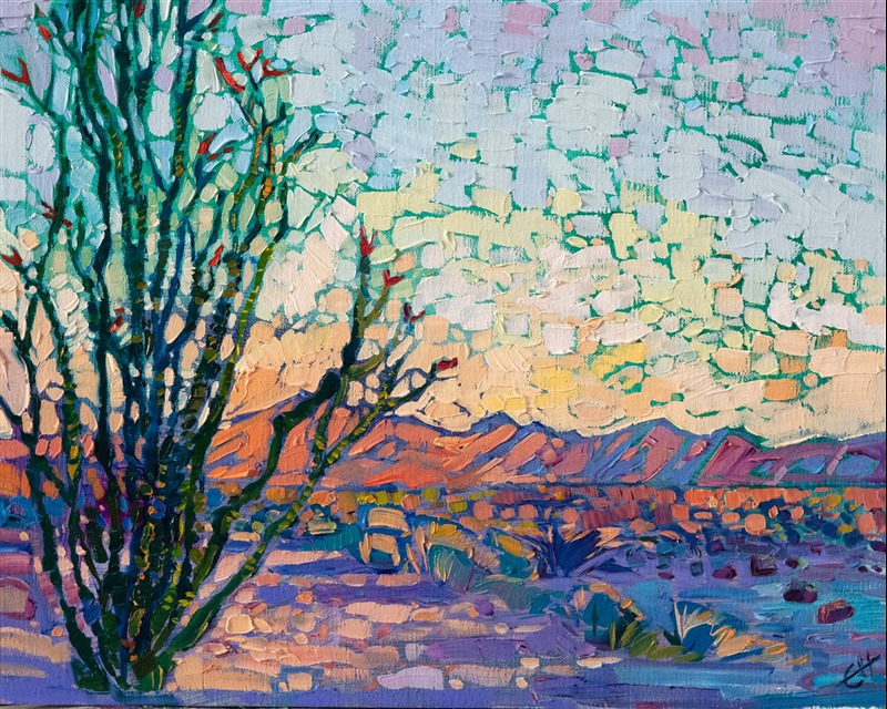 Note on varnishing: Erin’s paintings take six to eight weeks to dry, at which time we apply a retouching varnish, which allows the painting to complete the curing process while having a layer of protection against dirt and scuffs. The full curing process for an impasto oil painting takes at least two years. We are happy to assist in applying a final finishing varnish to your Erin Hanson oil painting once it has been dry for at least two years. Here is more information on how to care for your original oil painting.