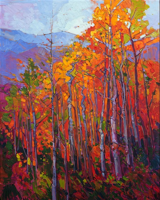 This painting was inspired by last October's travels through Colorado and Utah to capture the golden colors of changing aspen leaves. Their warm bursts of color are set off by the cool tones of the distant mountain slopes, while the thickly applied oil paint adds energy and movement to the composition.