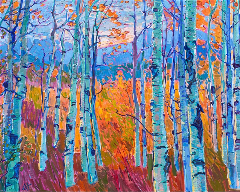 Framing: "Aspen Hues" is an original oil painting by Erin Hanson. The painting arrives framed in a gold leaf floater frame that sets off the warm colors in the painting.