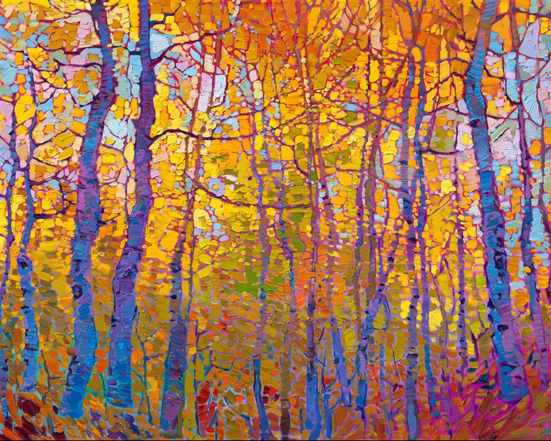 "Aspen Mosaic" was created on gallery-depth canvas, with the painting continued around the edges. The piece arrives framed in a contemporary gold floater frame finished in 23kt burnished gold leaf.