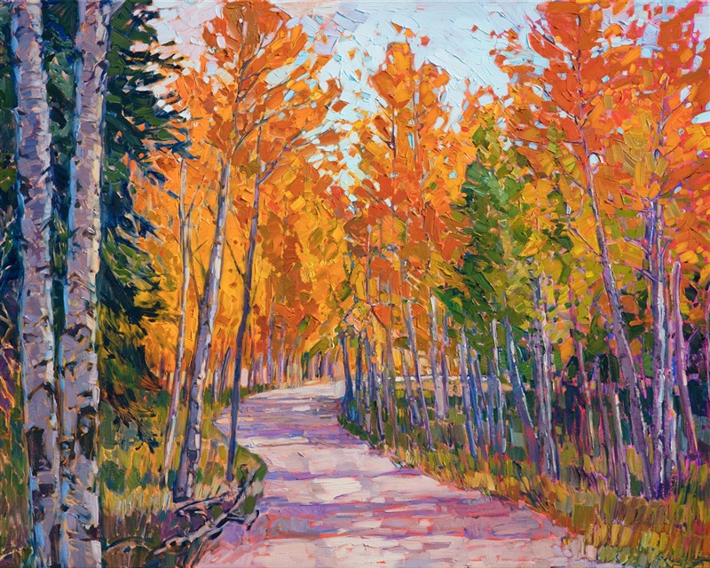 Cedar Breaks National Monument is home to some of the most beautiful aspen groves in Utah. The bright orange and yellow coin-shaped leaves sparkle and jingle in the wind, immersing you in sound and color. This painting has loose, thick brush strokes of oil paint, the texture adding a sense of movement to the scenery.