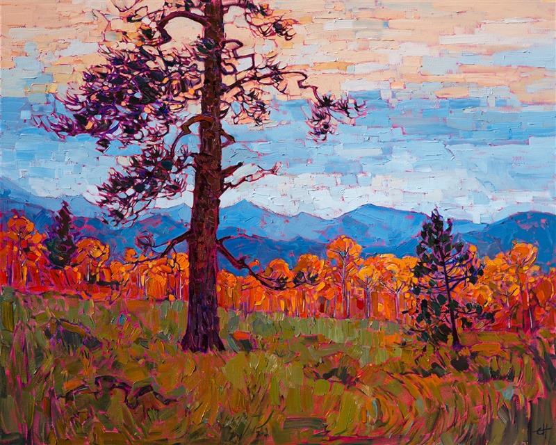 Southwest Utah color is captured in expressive texture and painterly brush strokes. This painting brings to life a transient moment of beauty seen at Cedar Breaks National Park, near Zion. The yellow-orange hues of the aspens are set off by the distant blue mountain ranges.