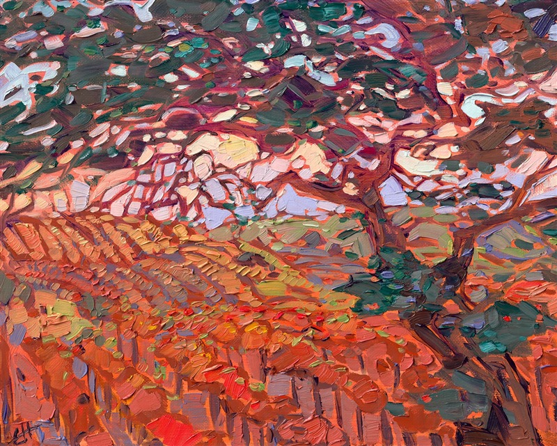 Note on varnishing: Erin’s paintings take six to eight weeks to dry, at which time we apply a retouching varnish, which allows the painting to complete the curing process while having a layer of protection against dirt and scuffs. The full curing process for an impasto oil painting takes at least two years. We are happy to assist in applying a final finishing varnish to your Erin Hanson oil painting once it has been dry for at least two years. Here is more information on how to care for your original oil painting.