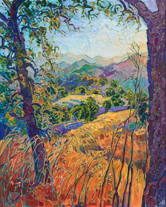 This painting was inspired by the hill-top view at Adelaida Winery, in Paso Robles, California. This modern impressionism painting was created with thick, painterly brush strokes and expressive color. The autumn summer light casts a warm glow across the landscape, highlighting the distant coastal mountain range.