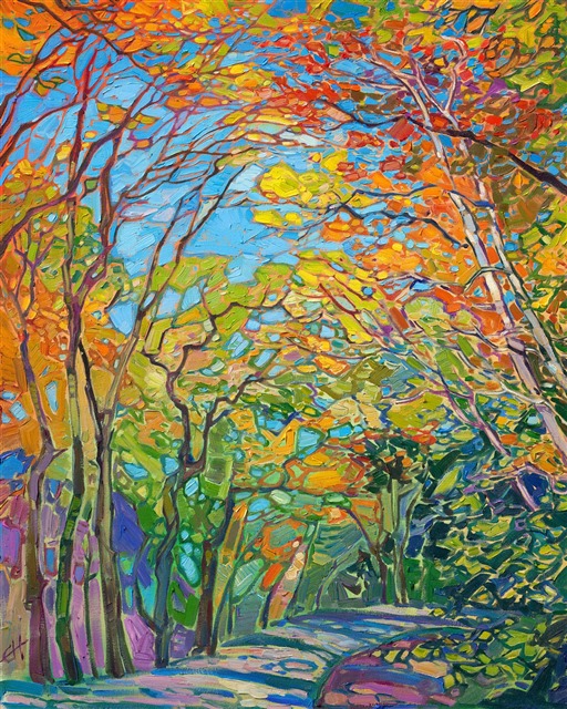 Delicate autumn light illuminates this tree-lined path, making the stately trees glow with fall colors. This painting captures the striking beauty of autumn with thick, expressive brush strokes of oil paint that have the feeling of stained glass.