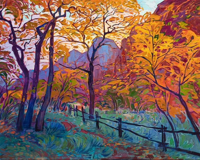 "Autumn in Zion" was created on gallery-depth canvas, with the painting continued around the edges. The piece arrives framed in a contemporary gold floater frame.