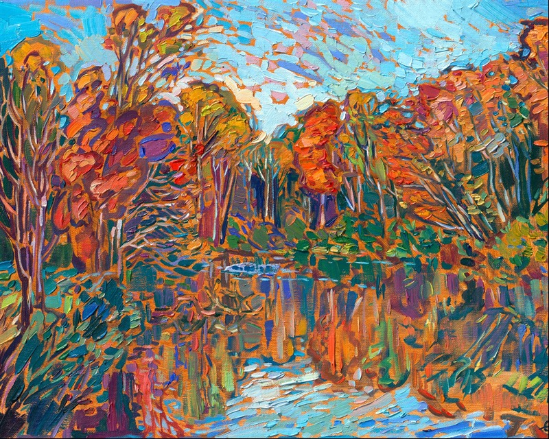 "Autumn Lake" is an original oil painting on linen board, done in Erin Hanson's signature Open Impressionism style. The piece arrives framed in a wide, mock floater frame finished in black with gold edging.