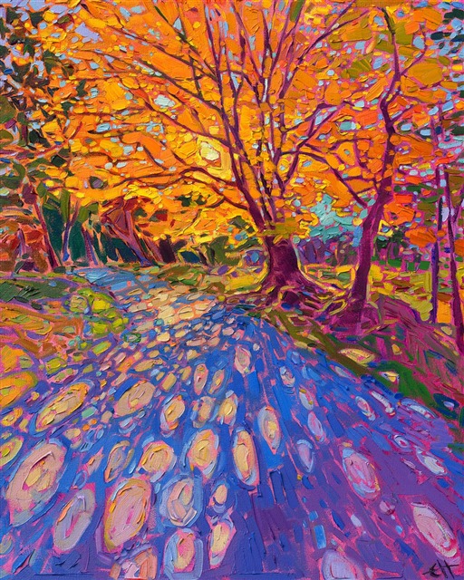"Autumn Lights" is an original oil painting by Erin Hanson, created on stretched canvas. The piece arrives framed in a custom floater frame finished in burnished, 23kt gold leaf.