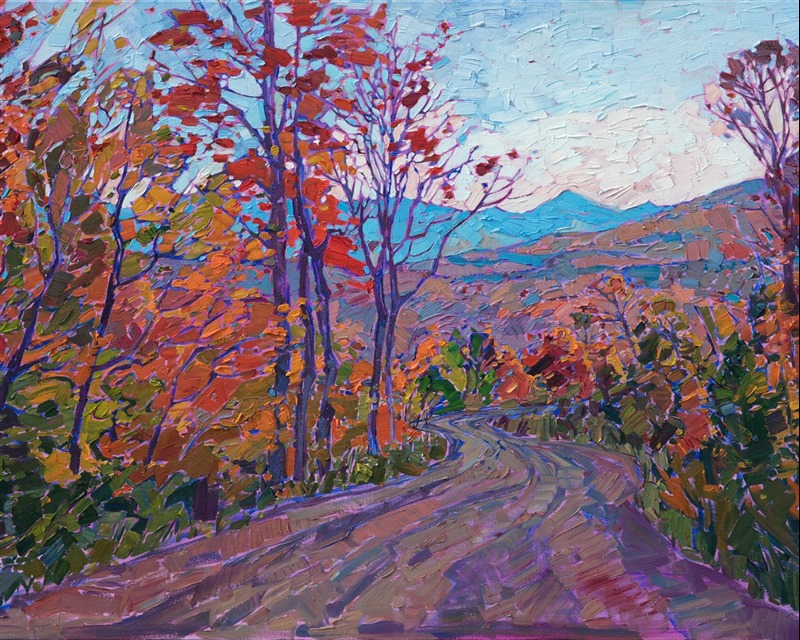 Style: "Open Impressionism" is a new style of painting developed by American artist Erin Hanson. The style is characterized by short, impasto brush strokes that are applied without layering, creating a mosaic or stained-glass appearance to the paintings. The paintings are created with a limited palette of colors, applied without blending or mixing upon the canvas, which adds a dimension of texture to each brush stroke. Inspired by classic impressionism, pointillism, and post-impressionism, Erin Hanson continues the tradition of impressionism into the modern day with her colorful and vivacious landscape paintings.