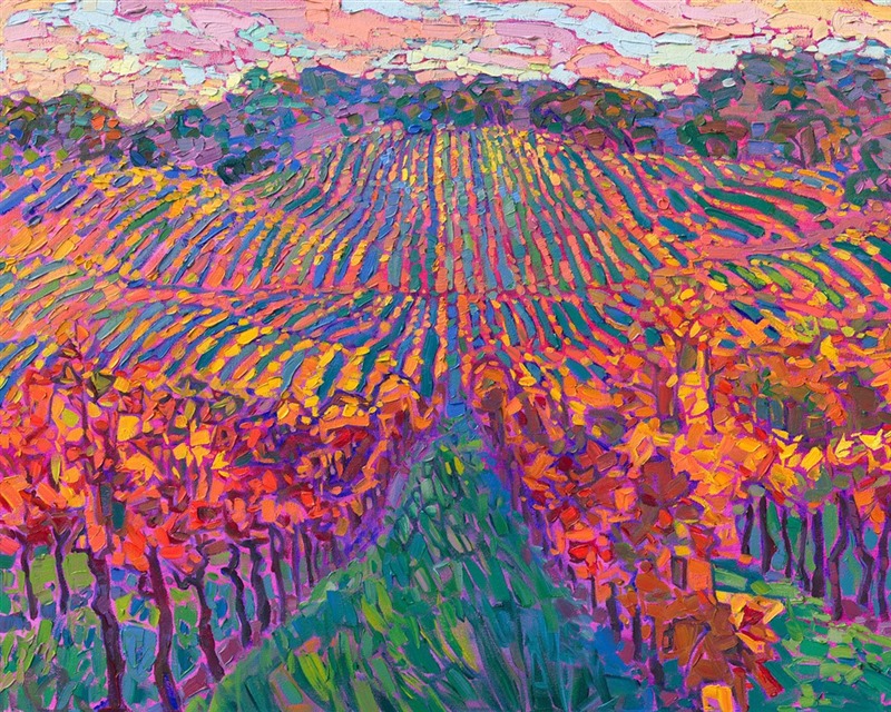 "Autumn Vineyard" is an original oil painting created on 1-1/2"-deep canvas, with the painting continued around the edges of the canvas. The piece arrives framed in a contemporary gold floater frame, ready to hang.