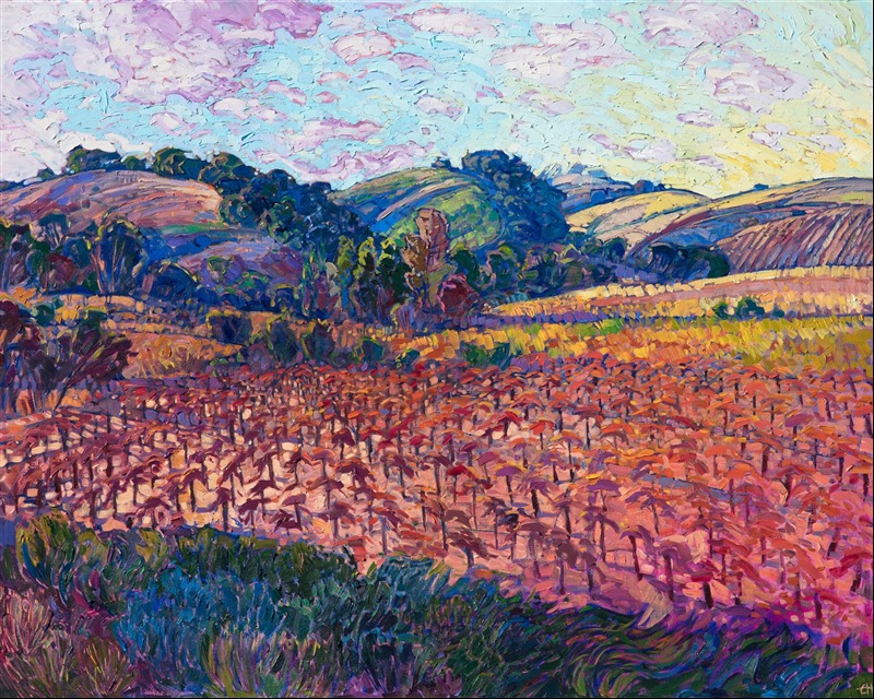 Note on varnishing: Erin’s paintings take six to eight weeks to dry, at which time we apply a retouching varnish, which allows the painting to complete the curing process while having a layer of protection against dirt and scuffs. The full curing process for an impasto oil painting takes at least two years. We are happy to assist in applying a final finishing varnish to your Erin Hanson oil painting once it has been dry for at least two years. Here is more information on how to care for your original oil painting.