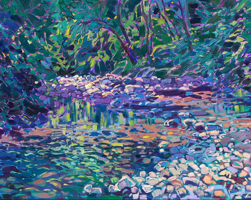 "Baker Creek" is an original oil painting on stretched canvas. The painting arrives in a hand-made, closed corner, champagne gold floater frame.