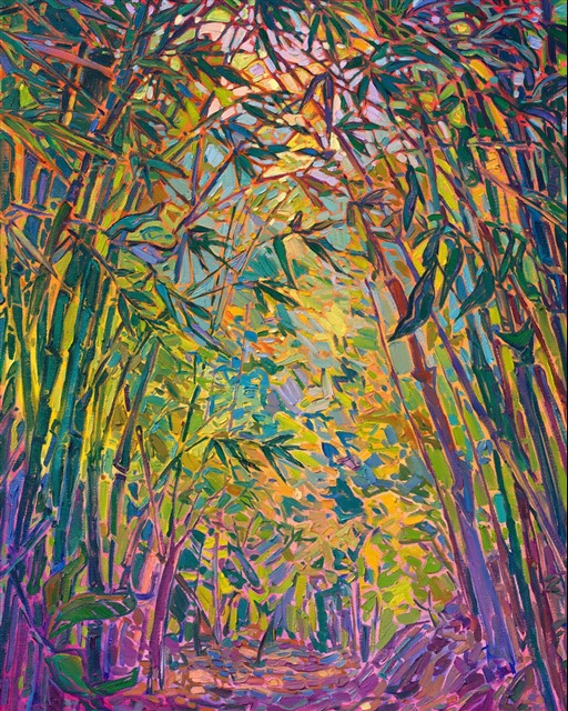 This oil painting captures a bamboo path in bold, impressionistic color. The painting seems to lead you into brighter depths of the painting, the crisscrossing bamboo leaves creating abstract shapes and mosaic patterns of color upon the canvas.