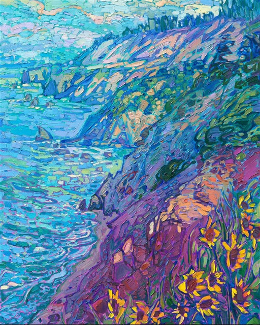 "Big Sur Blooms" is an original oil painting created on stretched canvas. The piece arrives framed in a contemporary gold floater frame, ready to hang.