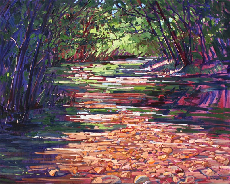 Style: "Open Impressionism" is a new style of painting developed by American artist Erin Hanson. The style is characterized by short, impasto brush strokes that are applied without layering, creating a mosaic or stained-glass appearance to the paintings. The paintings are created with a limited palette of colors, applied without blending or mixing upon the canvas, which adds a dimension of texture to each brush stroke. Inspired by classic impressionism, pointillism, and post-impressionism, Erin Hanson continues the tradition of impressionism into the modern day with her colorful and vivacious landscape paintings.