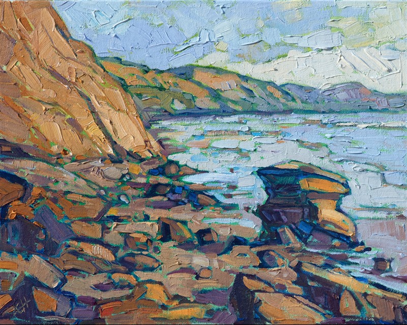 Black's Beach in San Diego is a striking beach, both in its beautiful rock coloration and the surprising nude factor (surprising for out-of-towners, anyways.) This painting captures the beautiful cliffs and subdued ocean colors of a late afternoon.