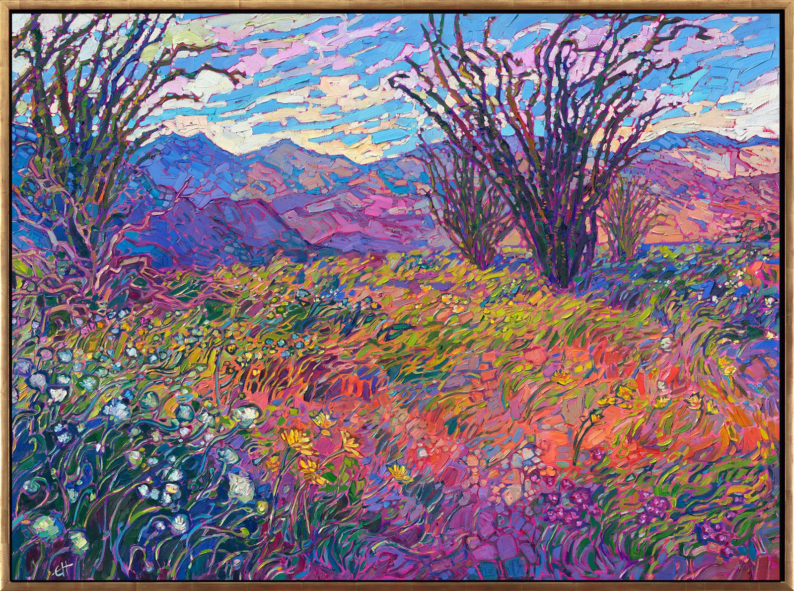 Borrego Springs is alive with color during its rare superblooms. White, purple, and yellow wildflowers dot the desert floor, blanketing the sand with unexpected bursts of color. This painting captures ocotillo and wildflowers against the steep mountains that surround Borrego Springs.