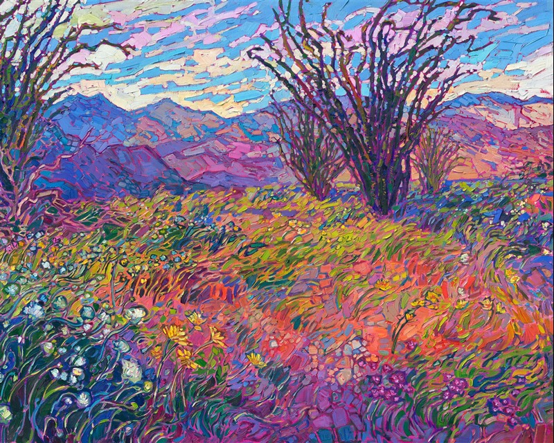 Style: "Open Impressionism" is a new style of painting developed by American artist Erin Hanson. The style is characterized by short, impasto brush strokes that are applied without layering, creating a mosaic or stained-glass appearance to the paintings. The paintings are created with a limited palette of colors, applied without blending or mixing upon the canvas, which adds a dimension of texture to each brush stroke. Inspired by classic impressionism, pointillism, and post-impressionism, Erin Hanson continues the tradition of impressionism into the modern day with her colorful and vivacious landscape paintings.