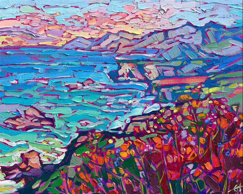"Blooming Coast" was created on linen board, and the painting arrives framed in a gold plein air frame, ready to hang.