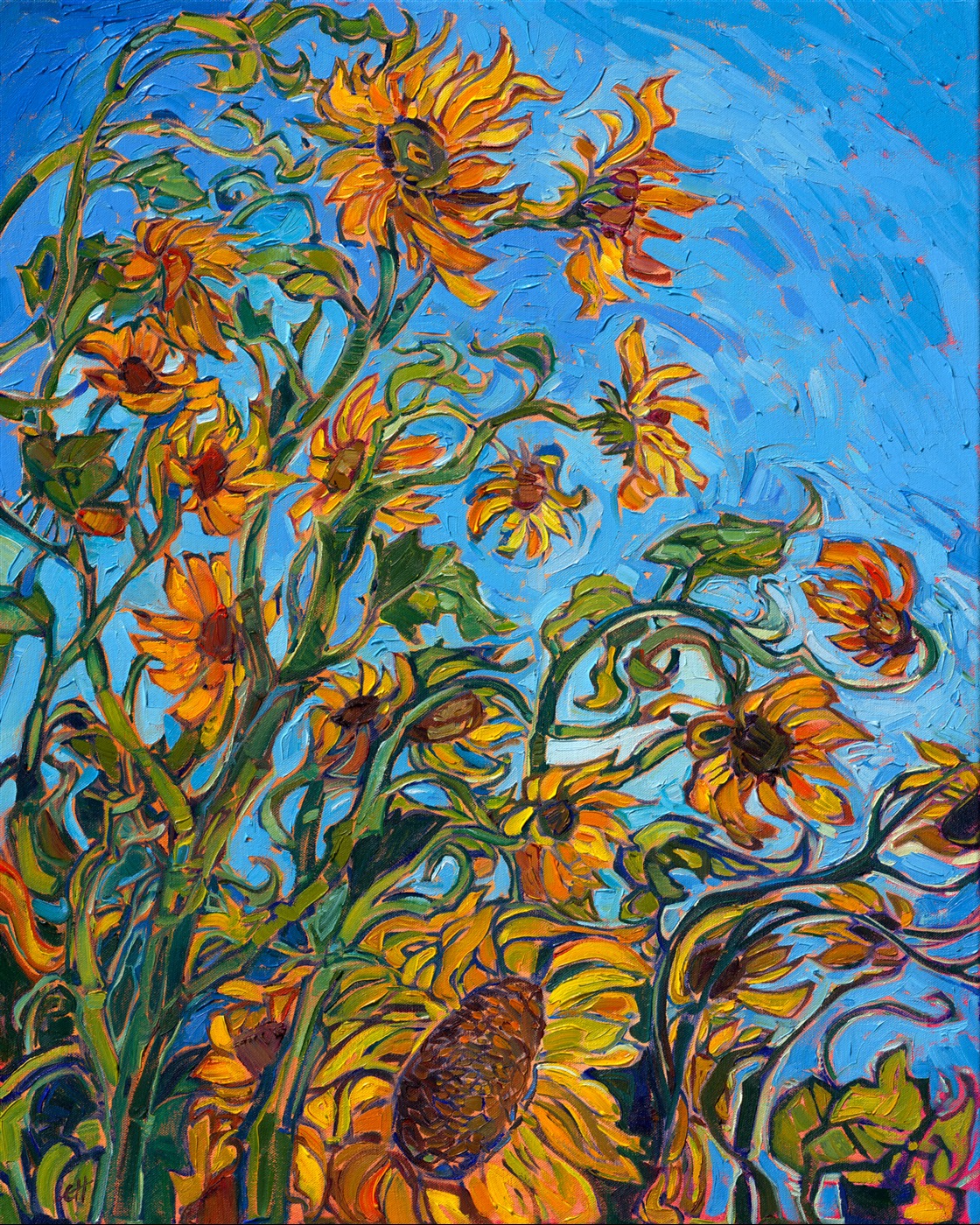 Northwestern sunflowers dance in the summer winds, sparkling with golden color against an azure sky. Thick brush strokes of impressionist paint capture the movement and vivacity of the scene.