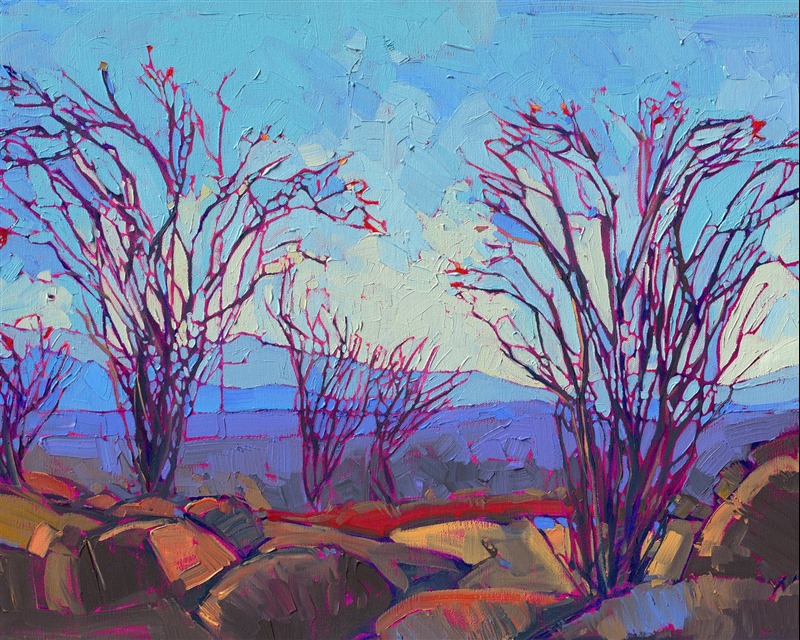Borrego Springs proudly presents its blooming ocotillos, their tall spider stalks bending under the weight of their heavy red flowers. The distant mountains appear clear and blue in the dry desert atmosphere. This painting is created with thick, impasto brush strokes that create a mosaic of color and texture.