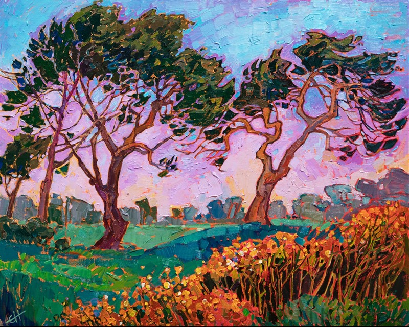 Note on varnishing: Erin’s paintings take six to eight weeks to dry, at which time we apply a retouching varnish, which allows the painting to complete the curing process while having a layer of protection against dirt and scuffs. The full curing process for an impasto oil painting takes at least two years. We are happy to assist in applying a final finishing varnish to your Erin Hanson oil painting once it has been dry for at least two years. Here is more information on how to care for your original oil painting.