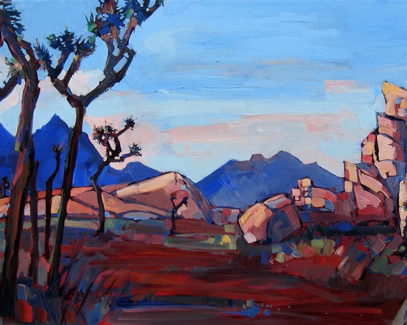Style: "Open Impressionism" is a new style of painting developed by American artist Erin Hanson. The style is characterized by short, impasto brush strokes that are applied without layering, creating a mosaic or stained-glass appearance to the paintings. The paintings are created with a limited palette of colors, applied without blending or mixing upon the canvas, which adds a dimension of texture to each brush stroke. Inspired by classic impressionism, pointillism, and post-impressionism, Erin Hanson continues the tradition of impressionism into the modern day with her colorful and vivacious landscape paintings.