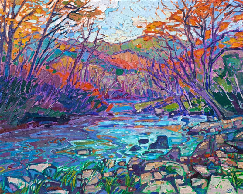 Style: "Open Impressionism" is a new style of painting developed by American artist Erin Hanson. The style is characterized by short, impasto brush strokes that are applied without layering, creating a mosaic or stained-glass appearance to the paintings. The paintings are created with a limited palette of colors, applied without blending or mixing upon the canvas, which adds a dimension of texture to each brush stroke. Inspired by classic impressionism, pointillism, and post-impressionism, Erin Hanson continues the tradition of impressionism into the modern day with her colorful and vivacious landscape paintings.