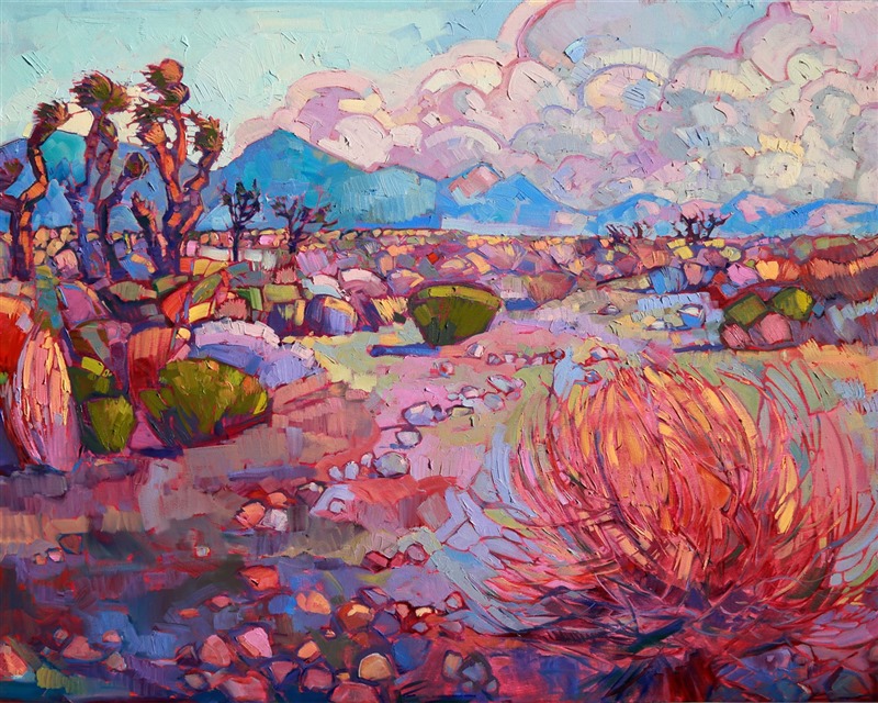 Style: "Open Impressionism" is a new style of painting developed by American artist Erin Hanson. The style is characterized by short, impasto brush strokes that are applied without layering, creating a mosaic or stained-glass appearance to the paintings. The paintings are created with a limited palette of colors, applied without blending or mixing upon the canvas, which adds a dimension of texture to each brush stroke. Inspired by classic impressionism, pointillism, and post-impressionism, Erin Hanson continues the tradition of impressionism into the modern day with her colorful and vivacious landscape paintings.