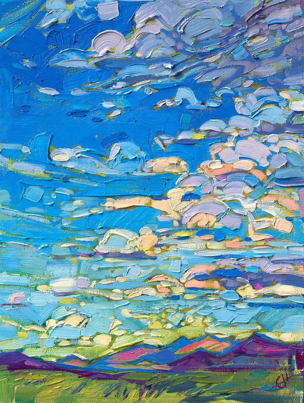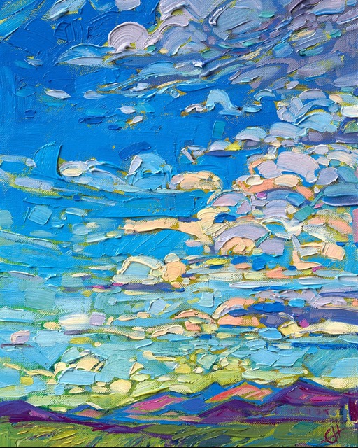 Note on varnishing: Erin’s paintings take six to eight weeks to dry, at which time we apply a retouching varnish, which allows the painting to complete the curing process while having a layer of protection against dirt and scuffs. The full curing process for an impasto oil painting takes at least two years. We are happy to assist in applying a final finishing varnish to your Erin Hanson oil painting once it has been dry for at least two years. Here is more information on how to care for your original oil painting.