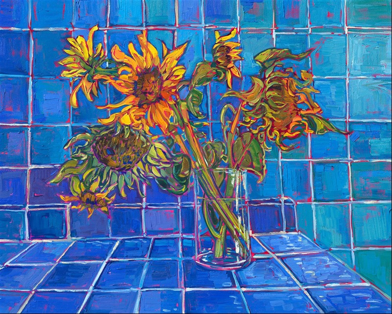 "Blue Tiles and Sunflowers" is an original oil painting on stretched canvas. The piece arrives framed in a contemporary gold floater frame, ready to hang.