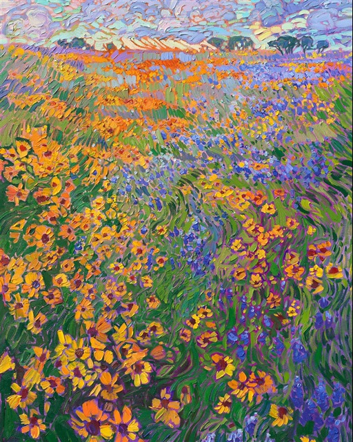 Erin devoted three years to perfecting the technology of 3D art printing in a quest to create a fine art print that captured her vibrant colors and reproduced the texture crucial to her artistic vision. The rhythms of texture in her luscious, impasto oil paintings communicate the movement and joy she finds in nature.