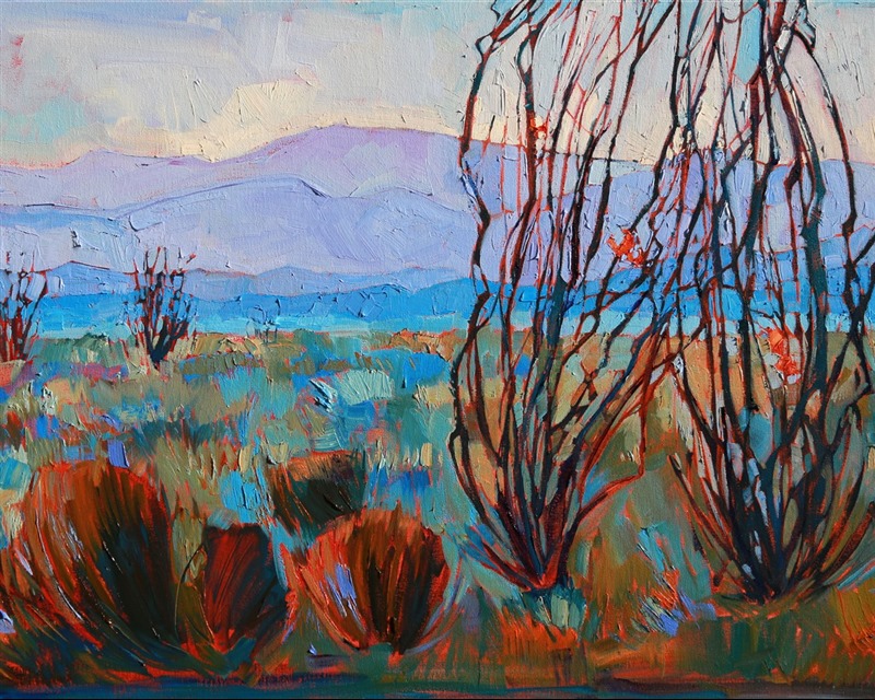 Borrego Springs ocotillos are one of the artist's favorite subjects to paint. Their spidery branches create a network of abstract shapes against the desert sky. In this painting, the artist communicates the beautiful red-orange of the ocotillo flower with a entire landscape of cool contrasting color.